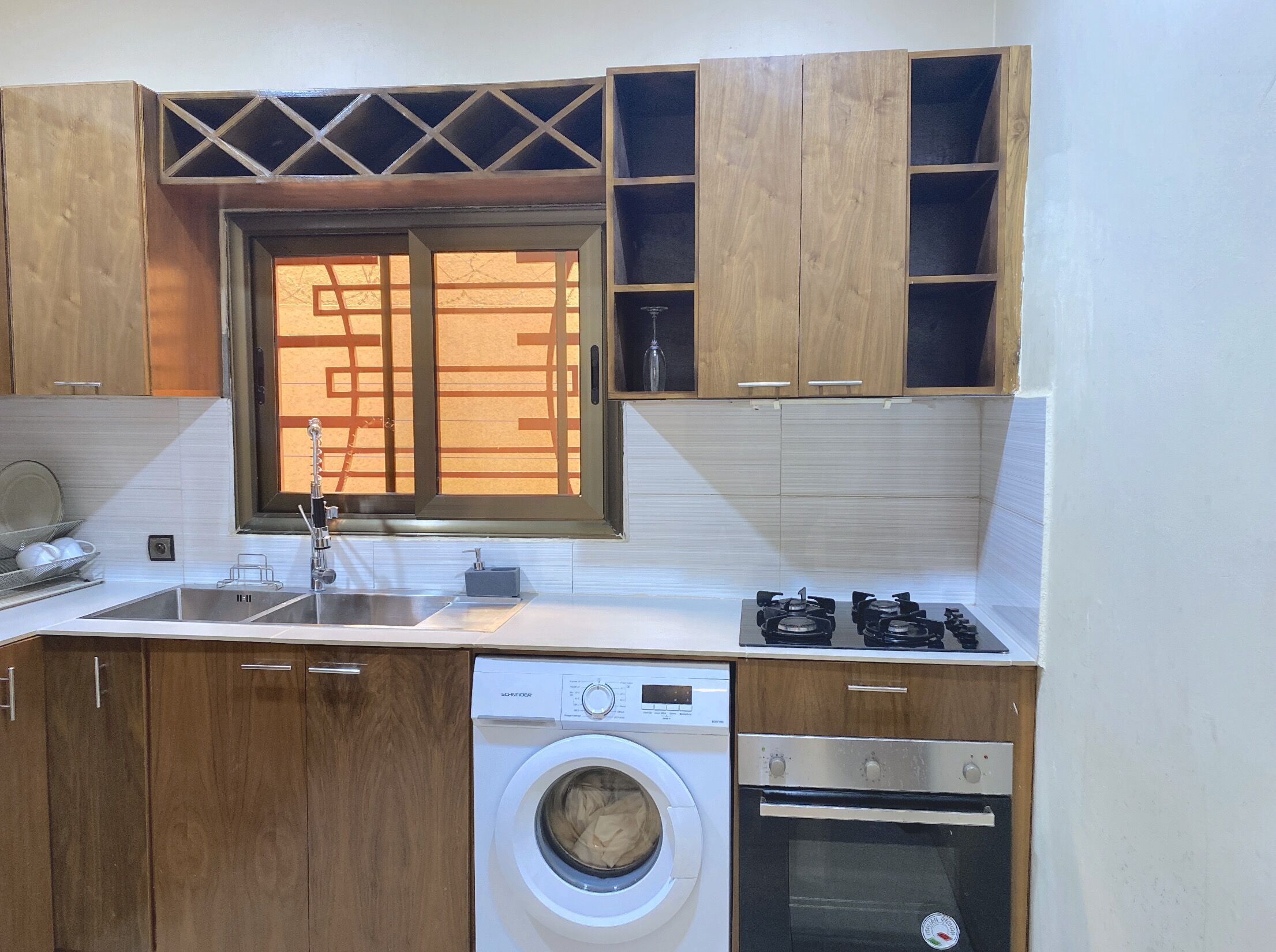 01 cuisine équipée de gazinière, congélateur, micro-onde, placards
