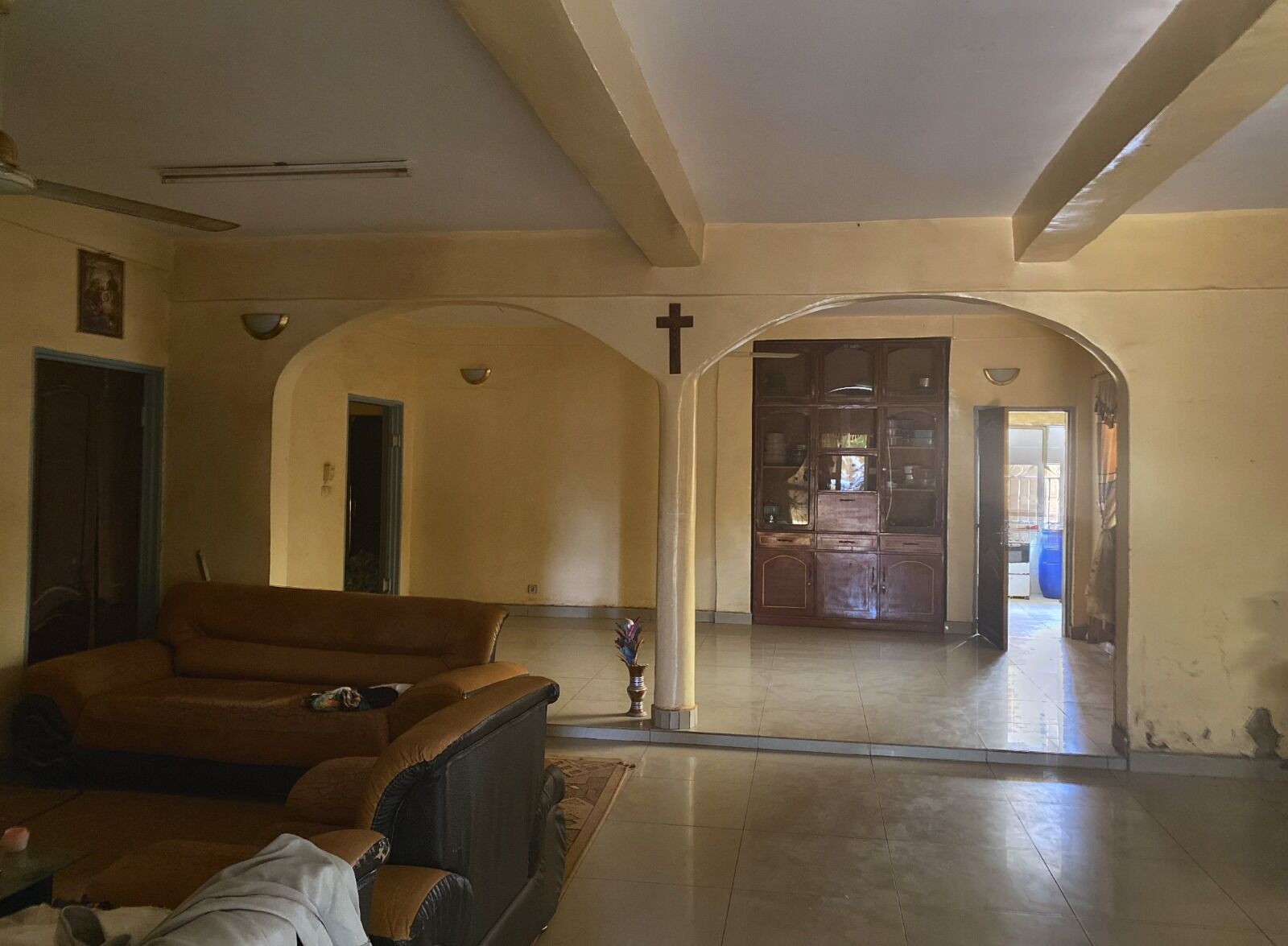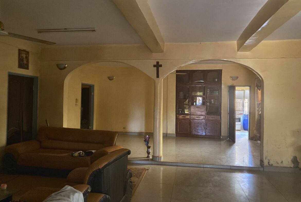 Le rez-de-chaussée est immédiatement habitable avec seulement de légères retouches de peinture à prévoir. Il comprend un vaste salon lumineux, une salle à manger spacieuse, une cuisine fonctionnelle et quatre chambres dont une suite parentale autonome. Les extérieurs offrent un garage couvert, un studio indépendant idéal pour recevoir ou travailler, et une grande cour avec toilettes externes.
